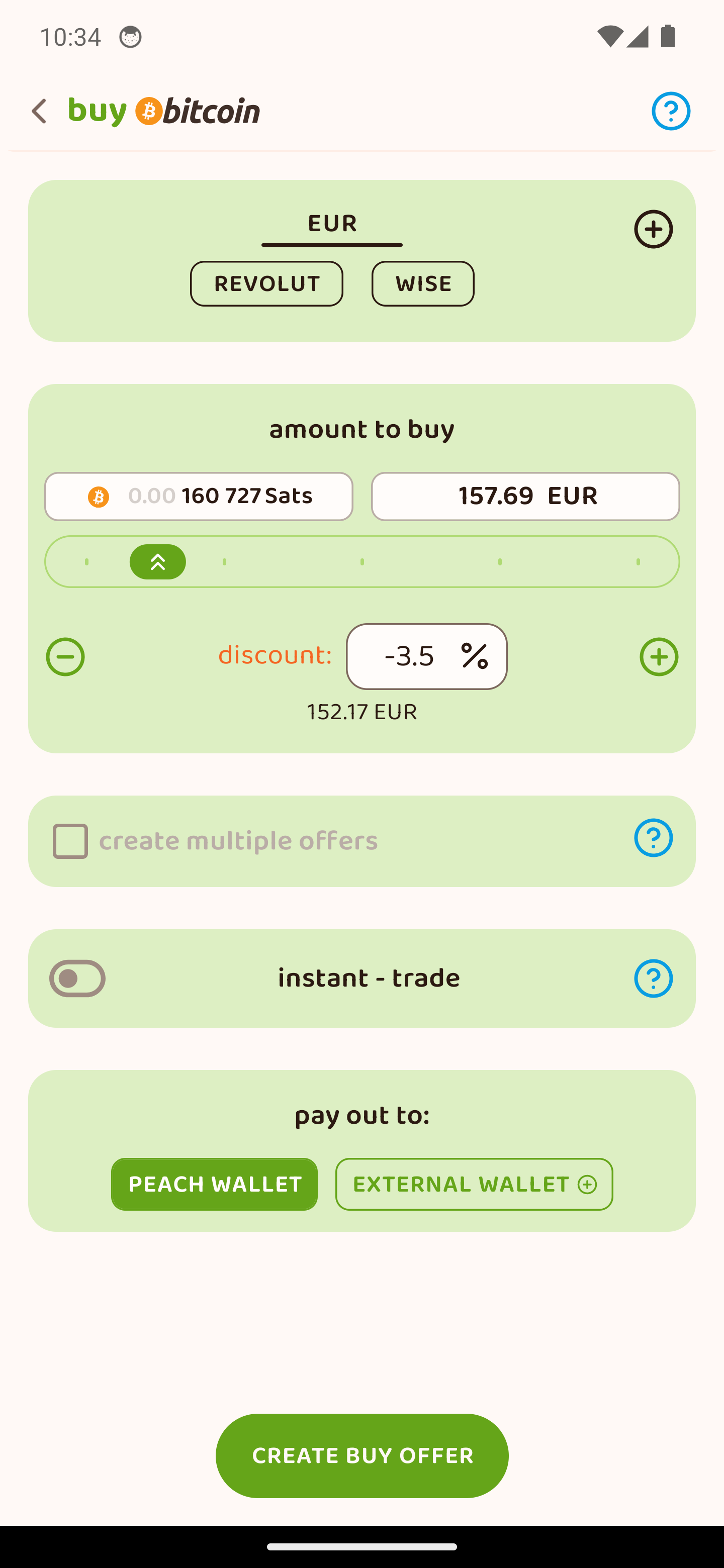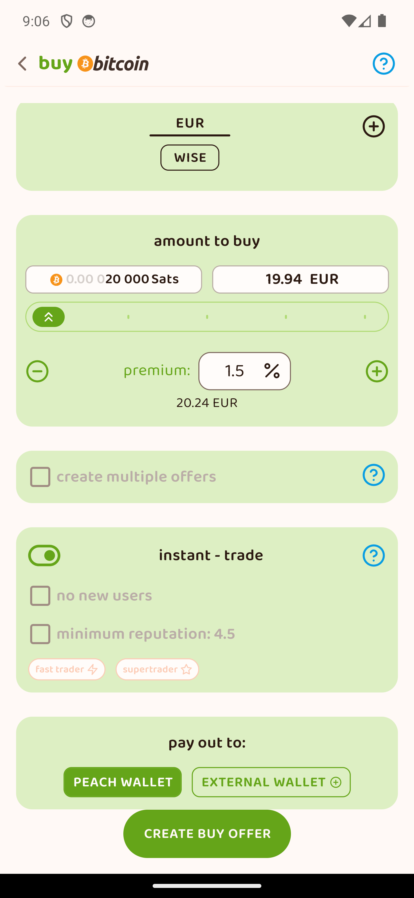 Η δημιουργία πρώτης προσφοράς αγοράς παίρνει δευτερόλεπτα. Ρύθμισε: ποσό αγοράς, αποδεκτά νομίσματα και μεθόδους πληρωμής, την τιμή που θέλεις να αγοράσεις και το πορτοφόλι πληρωμής (payout).